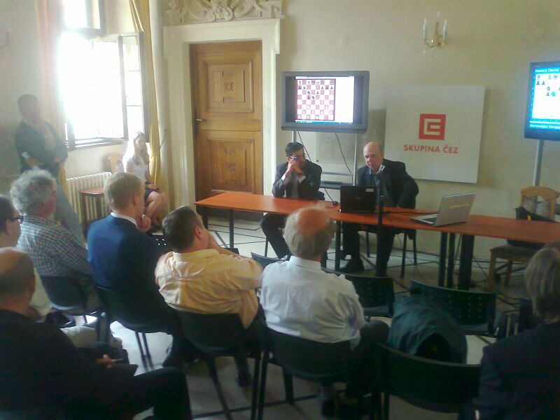 Po slavnostním zahájení, kdy první tah udělal Viswanathan Anand, jsme se odebrali do komentátorské místnosti. K našemu milému překvapení vedle vrchního komentátora GM Lubomíra Kaválka zasedl i sám mistr světa. Vzhledem k tomu, že na začátku partie byla v hracím sále malá pyrotechnická vložka, Anand na přání diváků okomentoval svou jedinou prohru, kterou utržil předcházející den v simultánce. Podívat se na to můžete zde (video je dost nekvalitní, bohužel jsem měla k dispozici pouze mobil).